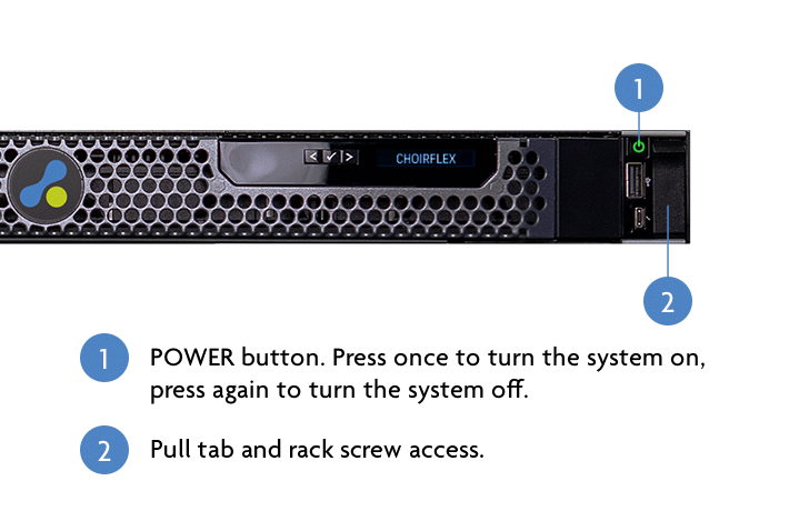 After connection to an appropriate power source, the POWER button may be momentarily depressed to start the processor. Upon connection of a power source, the status LED on the left side of the server will glow blue after some time, which is normal. Upon power-up, the POWER button will glow green. At any point, momentarily depress the POWER button to turn Choirflex off, and wait for the unit to power off. Do not shut down Choirflex by removing power to the unit before safely turning off the unit with the POWER button. Only remove power after the system has been safely shut down using the POWER button and the LED behind the POWER button is no longer illuminated.